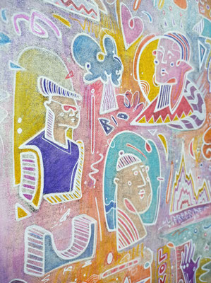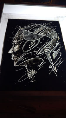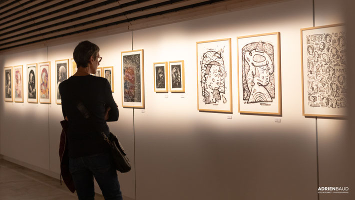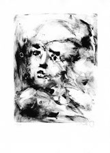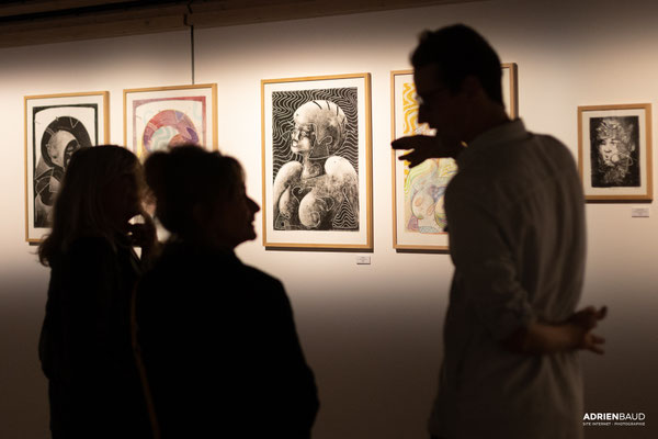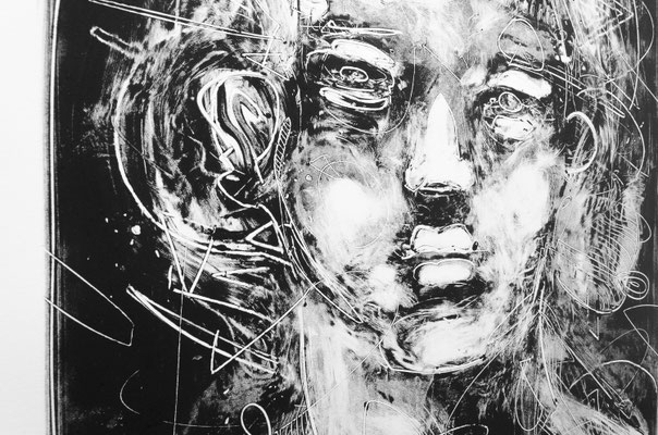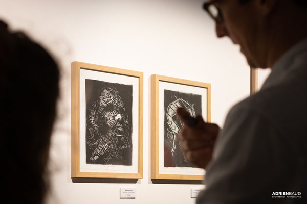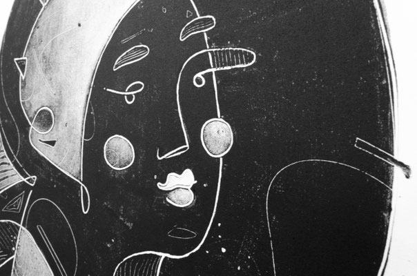 Le monotype est un procédé d’impression sans gravure qui produit un tirage unique. Il s’agit là de peindre à l’encre typographique ou encore à l’encre taille douce sur un support non poreux comme le plexiglas. La peinture est ensuite passée sous presse avec un papier qui reçoit l’épreuve. Il est possible de tirer une seconde épreuve, plus faible, avec le résidu d’encre demeurant sur la matrice. Je peux alors revenir sur les épreuves après tirage en les rehaussant de couleurs. J'aime créer ce parallèle d’œuvres qui fonctionnent souvent par pair. D'abord un premier tirage en noir résultant d'un travail de soustraction de l'encre grasse du plexiglas, puis contrairement au deuxième tirage, appelé "épreuve fantôme", la couleur est ajoutée à la main et au crayon aquarelle. D'une façon contrôlée, je réinterprète le monotype avec ma technique de dessin et vient contrebalancer le résultat obtenu du premier tirage. Cela crée alors une dualité intéressante dans la lecture de l’œuvre, deux techniques différentes pour un même sujet.