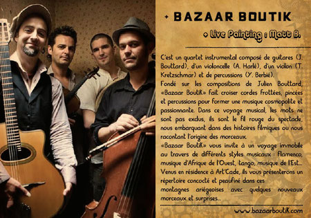 "Quand la peinture dialogue avec la musique : une performance explosive et unique où les gestes du peintre répondent aux rythmes du DJ. Un face-à-face vibrant entre sons électro, world groove et art visuel".