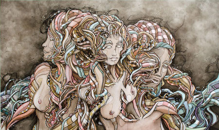 Evoluant autour du rêve et de l’imaginaire, le corps humain est au centre des créations de Matt B, ses œuvres étant comme des hymnes à la splendeur féminine, charnelle et maternelle. Organique et fouillé dans son travail, l’artiste déforme et déstructure ses personnages, les mettant en mouvement dans des tracés tortueux avec un souci du détail quasi obsessionnel. Sa peinture foisonnante et mystique laisse une grande liberté d’interprétation au spectateur, lequel abordera la toile comme une porte ouverte sur son propre inconscient. Son univers onirique, sensible et personnel est une véritable invitation au voyage mental. Embarquement immédiat garanti.